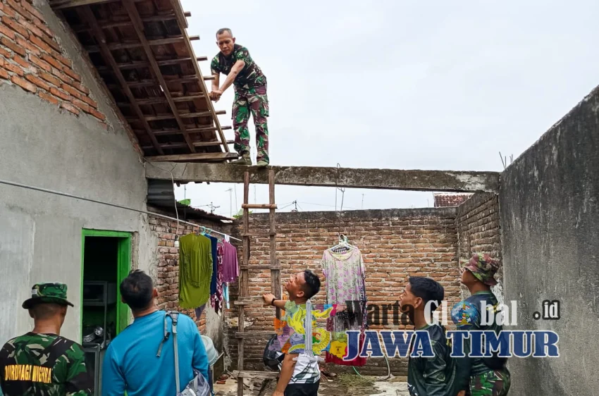 BOJONEGORO, -Warta global.id.Jatim. Bersama Perangkat Desa dan puluhan warga RT.028 dan RT.006/RW.001 Desa Campurejo, Selasa (30/9/2025), jajaran Bintara Pembina Desa atau Babinsa Koramil 01/Bojonegoro Kodim 0813 Bojonegoro melaksanakan karya bakti membantu pemasangan genteng rumah warga yang rusak akibat hujan deras disertai angin kencang.