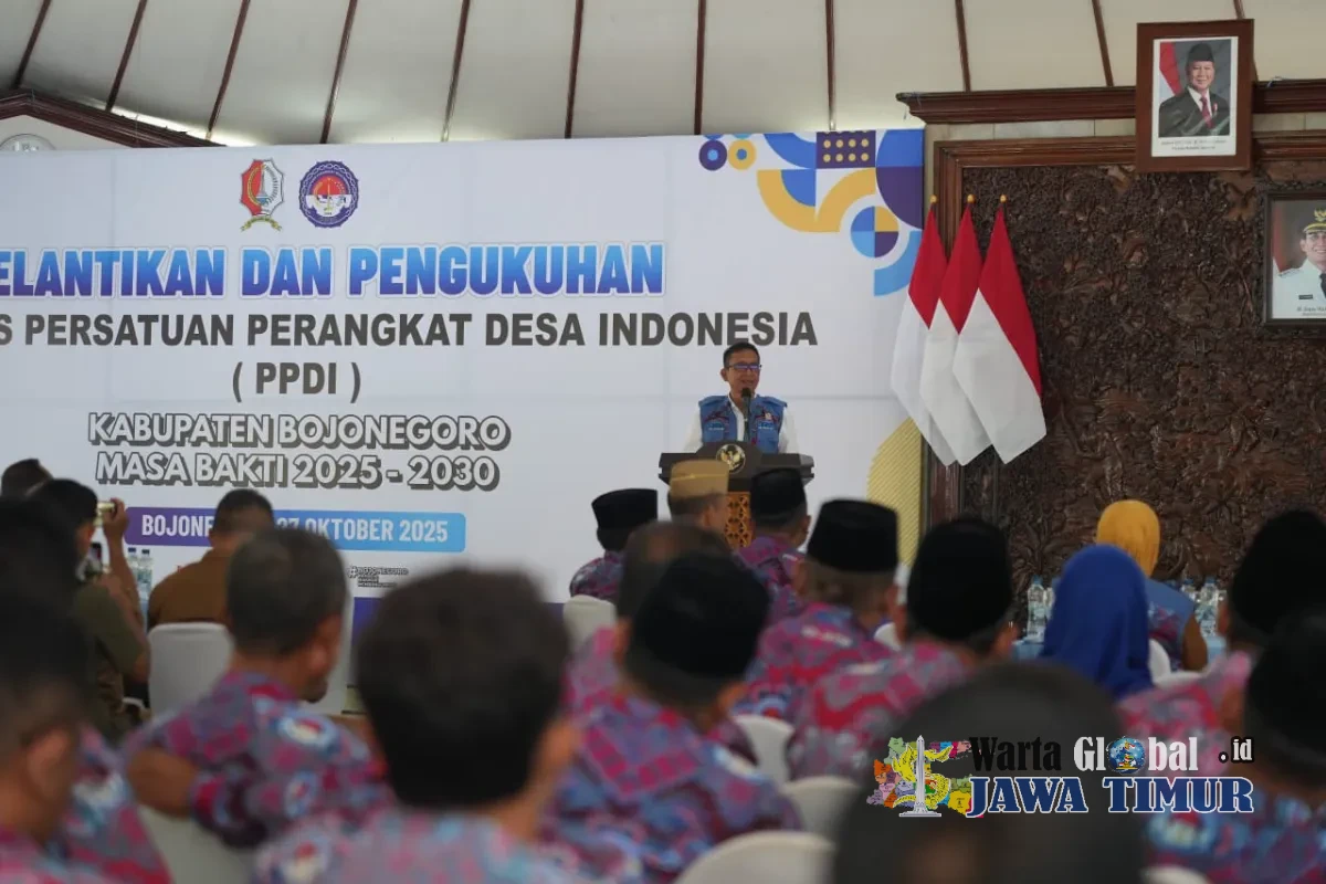 Bojonegoro –Warta global,id ,Jatim. Sebanyak 60 perwakilan perangkat desa se-Kabupaten Bojonegoro resmi dilantik dan dikukuhkan sebagai Pengurus Perangkat Desa Indonesia (PPDI) Kabupaten Bojonegoro periode 2025–2030, Senin (27/10/2025). Prosesi pelantikan berlangsung khidmat di Pendopo Malowopati dan dihadiri langsung oleh Bupati Bojonegoro, Setyo Wahono, serta Wakil Bupati, Nurul Azizah.
