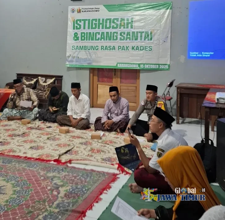 Gelar Istighotsah dan bincang santai sambung rasa, Kapala Desa Karangdowo, Ghufroni menyampaikan membangun desa butuh kerja sama dengan masyarakat, Rabu (15/10/25).