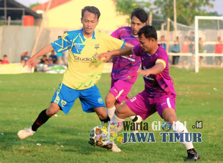 Satu pemain Persaba jersy kuning diapit dua pemain PSIT Terlangu ingin kuasai bola, Selasa (7/10/2025)