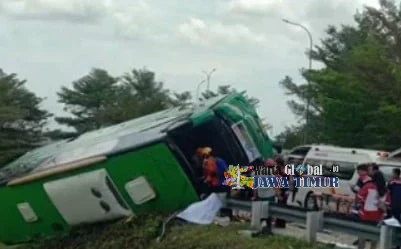 Bus berpenumpang 34 orang dengan tujuan tempat wisata Guci Kabupaten Tegal itu tidak mampu mengendalikan laju kecepatan dan mengalami gangguan pada sistem pengereman (rem blong) saat melewati tikungan di jalur keluar tol yang menyebabkan menabrak pembatas jalan dan terguling.