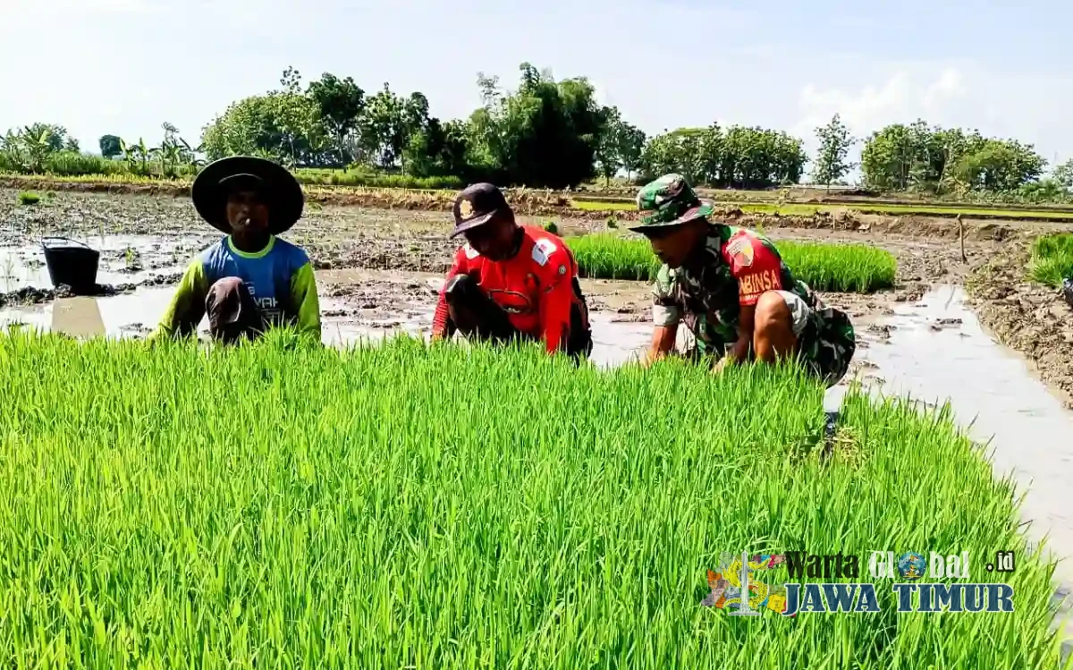 BOJONEGORO, - warta global.id.Jatim - Dalam rangka mendukung dan mensukseskan program pemerintah dibidang Ketahanan Pangan (Hanpangan), jajaran Babinsa Koramil 09/Sumberrejo Kodim 0813 Bojonegoro, menanam padi jenis inpari 32 bersama Kelompok Tani Rukun Sejati Desa Kedungrejo Kecamatan Sumberrejo.