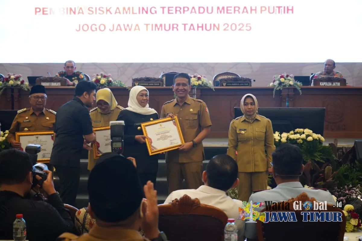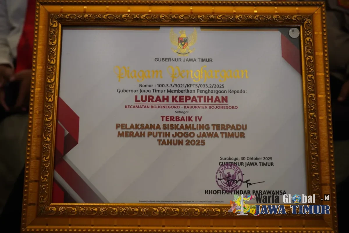 Surabaya — Warta global.Id.Jatim - Pemerintah Kabupaten Bojonegoro kembali menorehkan prestasi di tingkat Provinsi Jawa Timur. Bupati Bojonegoro Setyo Wahono bersama Kepala Kelurahan Kepatihan Kecamatan Bojonegoro, Putri Negari, menerima Penghargaan Terbaik IV Lomba Siskamling Terpadu Merah Putih Jogo Jawa Timur Tahun 2025, Selasa (4/11/2025).