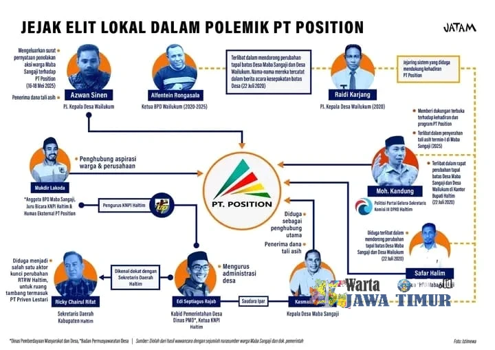 Malut, Invetigasi Warta Global - Konflik lahan di Maba Sangaji memasuki fase yang semakin rumit setelah laporan investigatif “Nikel dari Tanah Terampas – Laporan 2025” mengungkap dugaan keterlibatan dua pengurus Komite Nasional Pemuda Indonesia (KNPI) Halmahera Timur dalam proses perluasan konsesi tambang PT Position. Temuan ini menambah kekhawatiran publik tentang kuatnya jaringan kepentingan antara perusahaan, birokrasi desa, dan elite lokal yang berdampak langsung pada kriminalisasi warga adat.