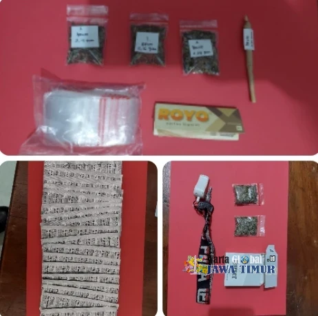 Barang bukti yang diamankan meliputi 3 paket narkotika jenis ganja dengan berat kotor total ± 6,38 gram, 1 linting ganja siap pakai dengan berat bruto ± 0,55 gram dan 19 blister (190 butir) obat keras jenis Alprazolam.