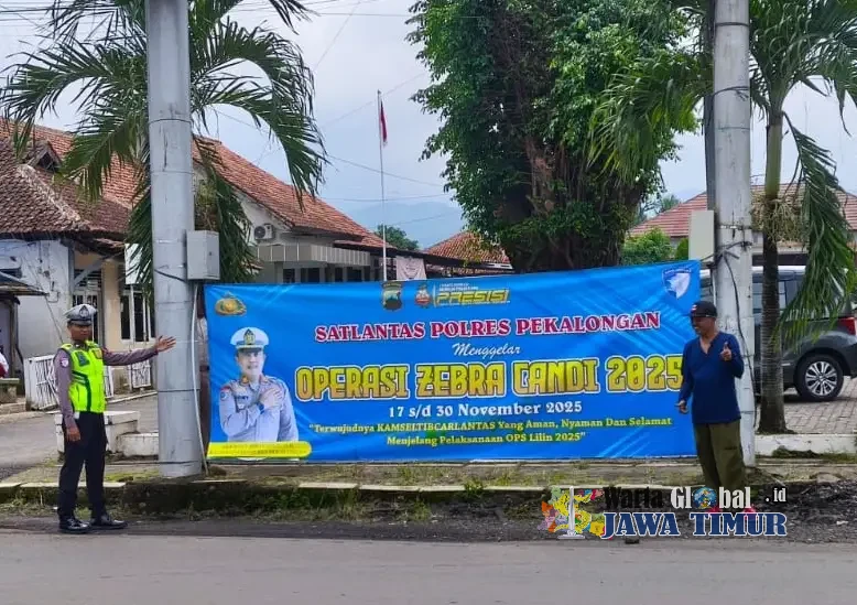 Petugas Sat Lantas Polres Pekalongan saat memasang Banner Peringatan dimulainya Operasi Zebra Candi 2025, Selasa (18/11/25)PEKALONGAN, WARTAGLOBAL.id --