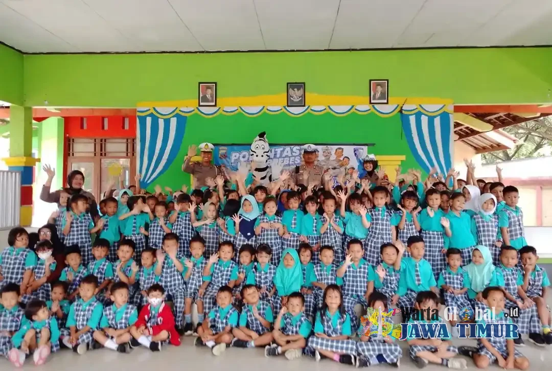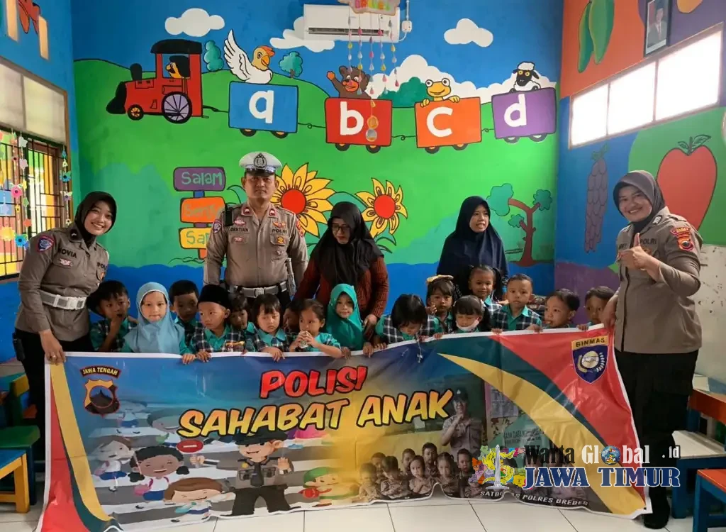 Petugas Polantas Polres Brebes menyapa dan mengajak Anak TK di Taman Kanak-Kanak (TK) Pertiwi Bermain di Kecamatan Brebes, Sabtu (1/11/25).BREBES, WARTAGLOBAL.id --
