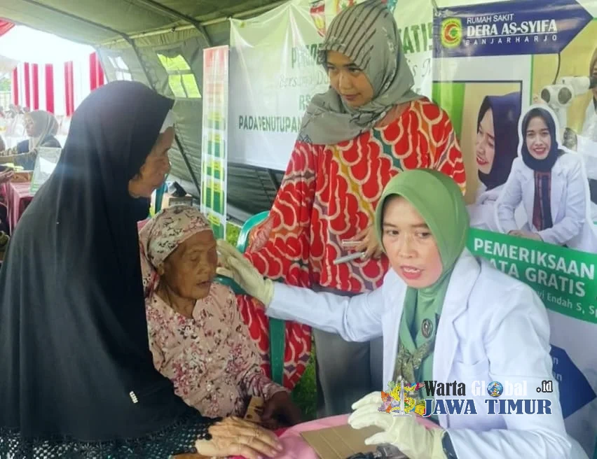 Tim medis RS Dera As-Syifa yang dipimpin oleh dr. Novi Endah, Sp.M, dokter spesialis mata bersama Direktur RS Dera As-Syifa, dr. Sari Putri Utami MARS, FISQua, CHMEE, CHCEE (baju kuning) sedang memeriksa warga yang berobat, Kamis (6/11/25).BREBES, WARTAGLOBAL.id --