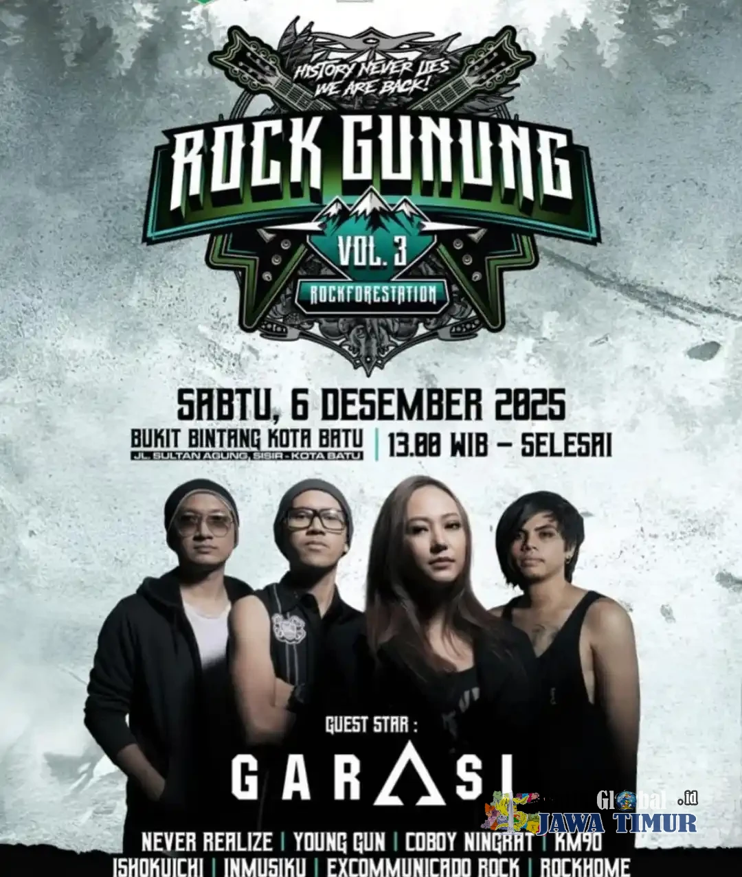 Jatim.wartaglobal.id|Kota Batu kembali menjadi pusat energi musik rock tanah air melalui gelaran Rock Gunung Vol. 3 dengan tema "ROCKFORESTATION" yang digelar hari ini, Sabtu (6 Desember 2025), mulai pukul 13.00 WIB hingga selesai di Bukit Bintang, Jl. Sultan Agung, Sisir – Batu. Acara ini dibuka secara GRATIS untuk umum, dengan tujuan mengangkat semangat alam, kreativitas, dan kebersamaan warga serta memperkuat ekosistem musik independen daerah.