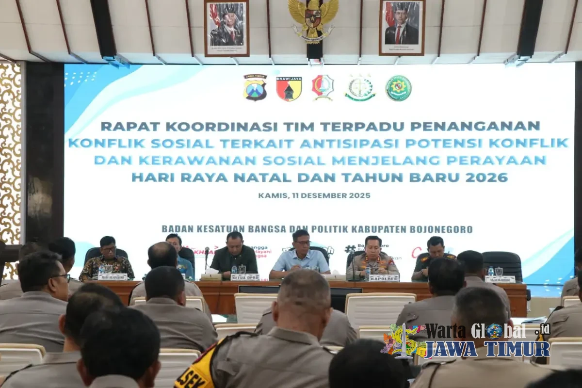 Bojonegoro. Jatim-Wartaglobal.id - Pemerintah Kabupaten Bojonegoro menggelar Rapat Koordinasi Tim Terpadu Penanganan Konflik Sosial dalam rangka mengantisipasi potensi konflik dan kerawanan sosial menjelang perayaan Natal dan Tahun Baru 2026. Acara yang berlangsung di Ruang Angling Dharmo (11/12) ini menghadirkan jajaran Forkopimda sebagai narasumber, meliputi Bupati Bojonegoro, Ketua DPRD Kabupaten Bojonegoro, Kapolres Bojonegoro, perwakilan Kodim 0813, Sekretaris Daerah Kabupaten Bojonegoro, serta Kepala BPBD Kabupaten Bojonegoro.