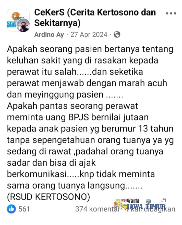 Gelombang kritik terhadap pelayanan RSUD Kertosono semakin menguat setelah unggahan berisi keluhan warga viral di grup Facebook CeKerS (Cerita Kertosono dan Sekitarnya). Postingan itu memicu ratusan komentar dari masyarakat yang mengaku mengalami pelayanan kurang baik di rumah sakit milik pemerintah daerah tersebut.