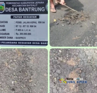 Proyek pembangunan jalan aspal yang bersumber dari Bantuan Pemerintah Provinsi (Banprov) di Desa Bantrung, Kecamatan Batealit, Kabupaten Jepara, kini menuai sorotan tajam Masyarakat. Pasalnya, Jalan desa yang baru saja rampung dikerjakan sudah mengalami kerusakan serius. Sehingga memunculkan pertanyaan besar terkait kualitas pekerjaan, pengawasan, dan tanggung jawab pihak-pihak terkait, Kamis (8/1/26).