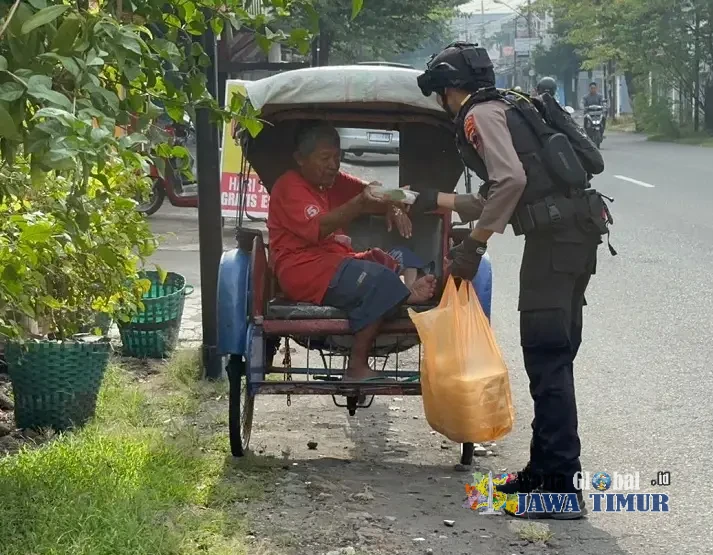 Anggota Tim Sparta Polresta Surakarta, saat membagikan Makanan kepada seorang Tukang Becak, Jumat (30/1/26).SURAKARTA, WARTAGLOBAL.id --