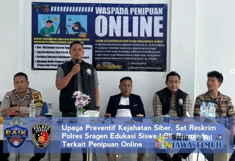 Upaya pencegahan kejahatan di dunia maya terus digencarkan oleh Polres Sragen. Salah satunya diwujudkan melalui kegiatan sosialisasi pencegahan penipuan online yang dilaksanakan Satuan Reserse Kriminal (Sat Reskrim) melalui Unit Tindak Pidana Tertentu (Tipidter), Kamis (15/1/26). Kegiatan ini menyasar siswa-siswi LPK Rasmindo Mitra Sukses yang berlokasi di Desa Kedungupit, Sragen.