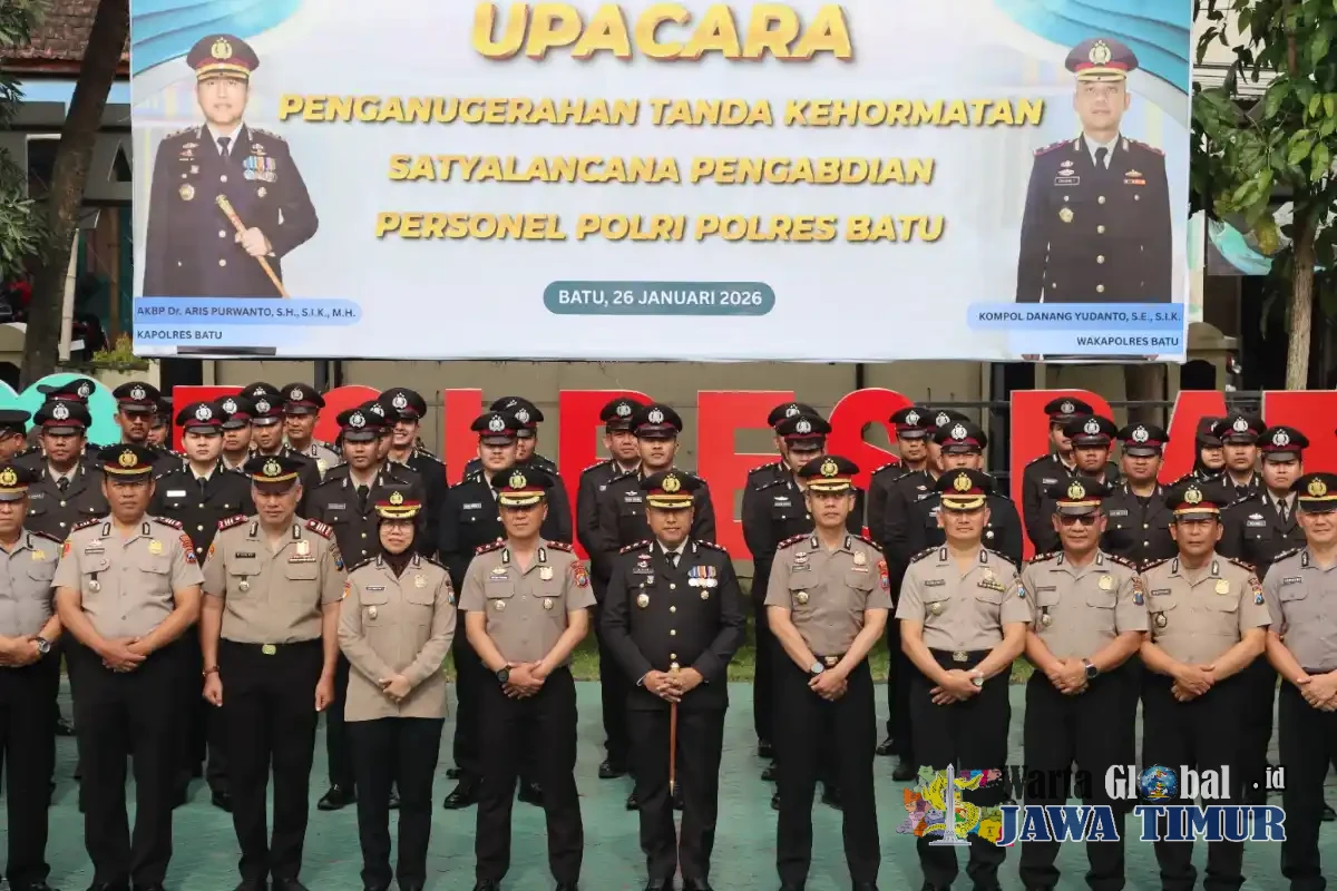 Jatim.wartaglobal.id|KOTA BATU, JAWA TIMUR - Upacara Penganugerahan Tanda Kehormatan Satyalencana Pengabdian digelar dengan khidmat di Lapangan Apel Mapolres Batu, Jalan AP. III Katjoeng Permadi, Desa Junrejo, Kecamatan Junrejo, Senin (26/01/2026). Acara yang diikuti oleh seluruh pejabat utama, perwira, bintara, dan PNS Polres Batu ini menjadi momen penghargaan atas kesetiaan para personel dalam mengabdi kepada negara.