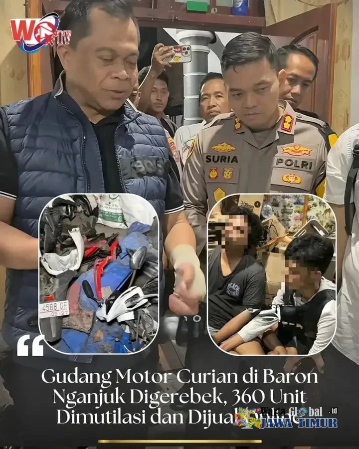 12 Februari 2026 ,Polres Nganjuk bekerja sama dengan Polrestabes Surabaya berhasil membongkar gudang penadah motor curian di wilayah sekitar Baron, Kabupaten Nganjuk. Dari lokasi tersebut, pihak berwenang menemukan bukti sebanyak 360 unit sepeda motor hasil curian yang diperkirakan berasal dari Surabaya, Sidoarjo, dan Mojokerto.