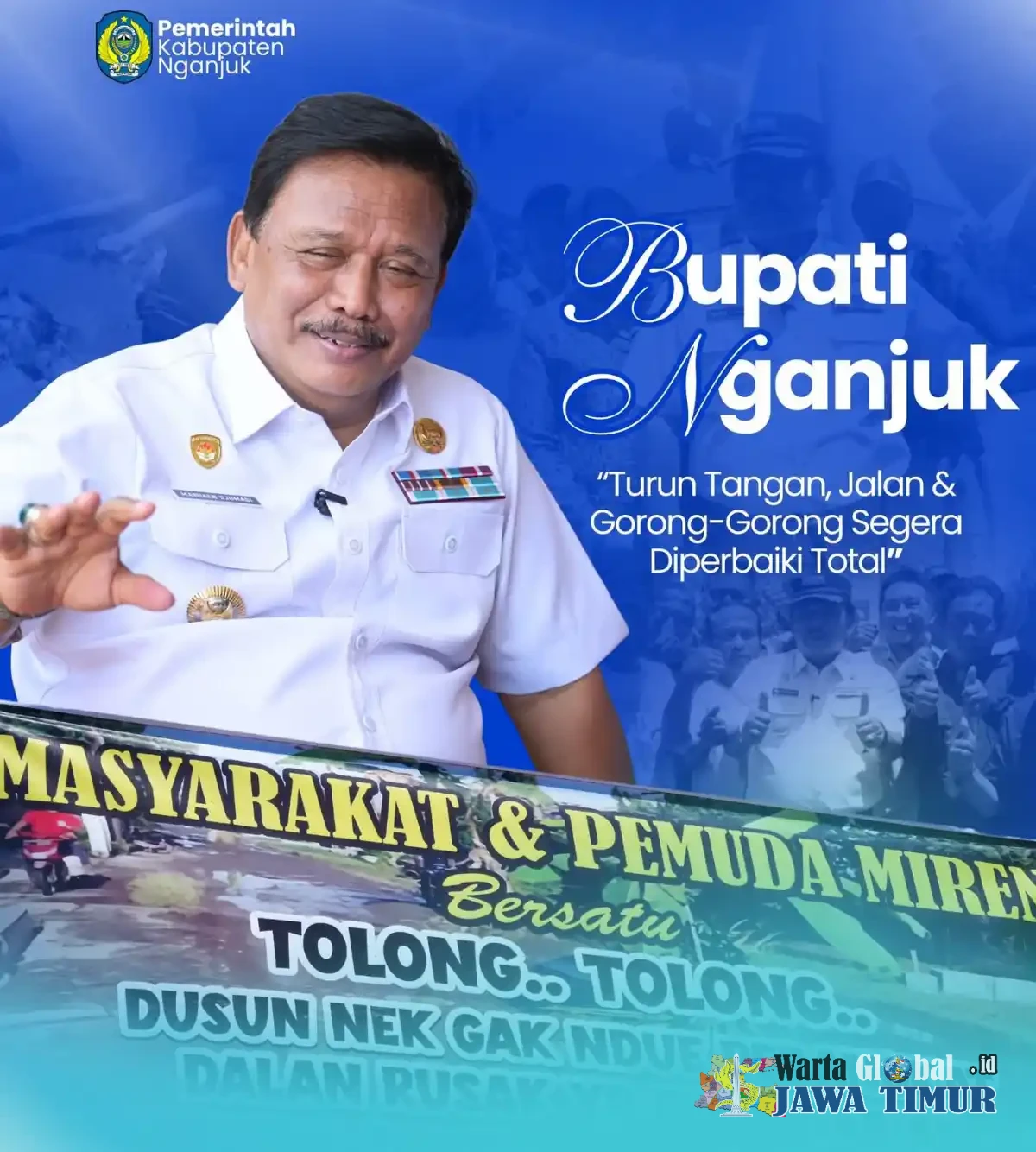 Warga Dusun Miren, Desa Sidoharjo, melakukan aksi protes kreatif dengan menanami jalan rusak menggunakan pohon pisang. Aksi tersebut langsung mendapat tanggapan dari Pemerintah Kabupaten Nganjuk. Bupati Marhaen Djumadi bersama Plt. Kepala Dinas Pekerjaan Umum dan Penataan Ruang (PUPR) segera meninjau lokasi dan menyampaikan solusi konkret atas keluhan jalan rusak yang telah berlangsung lama. Kunjungan tersebut menunjukkan komitmen pemerintah daerah untuk segera memperbaiki infrastruktur yang menjadi perhatian masyarakat.
