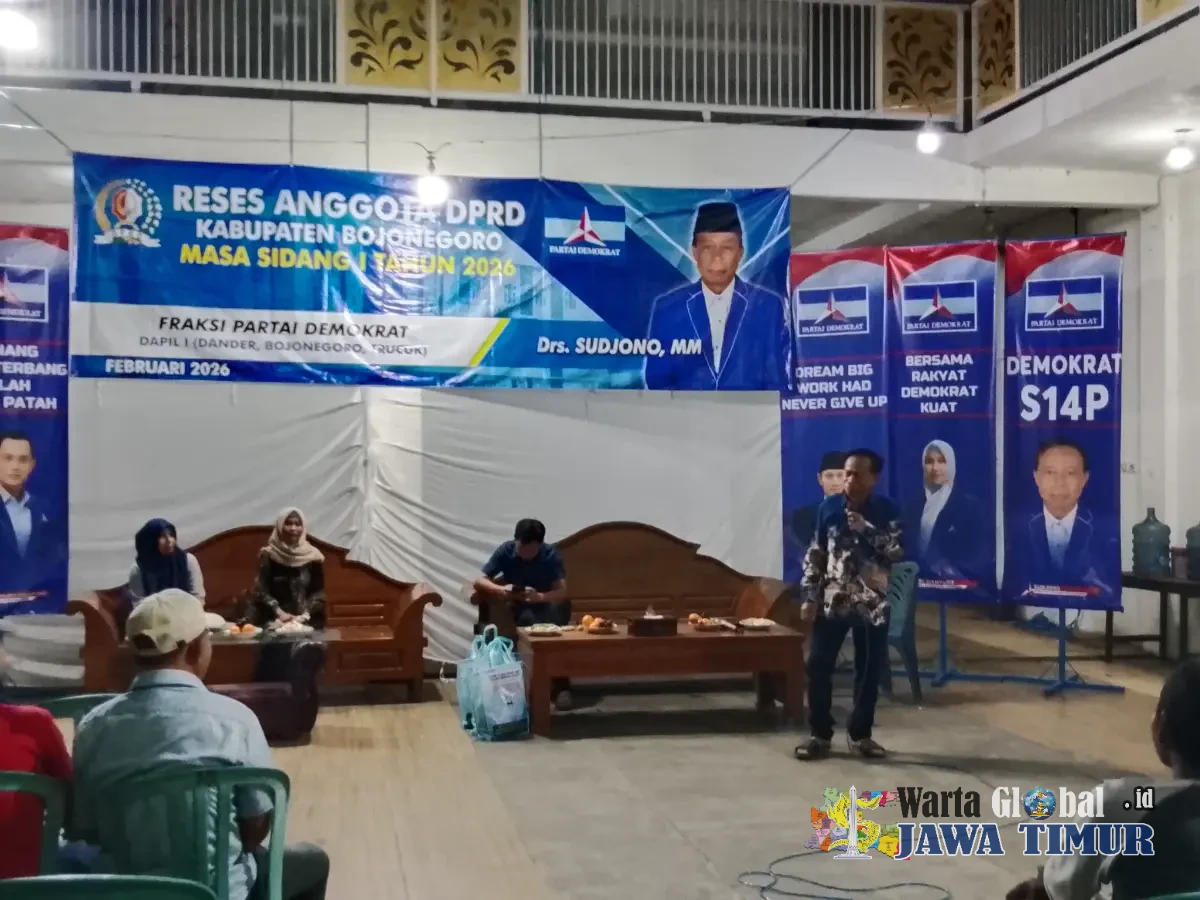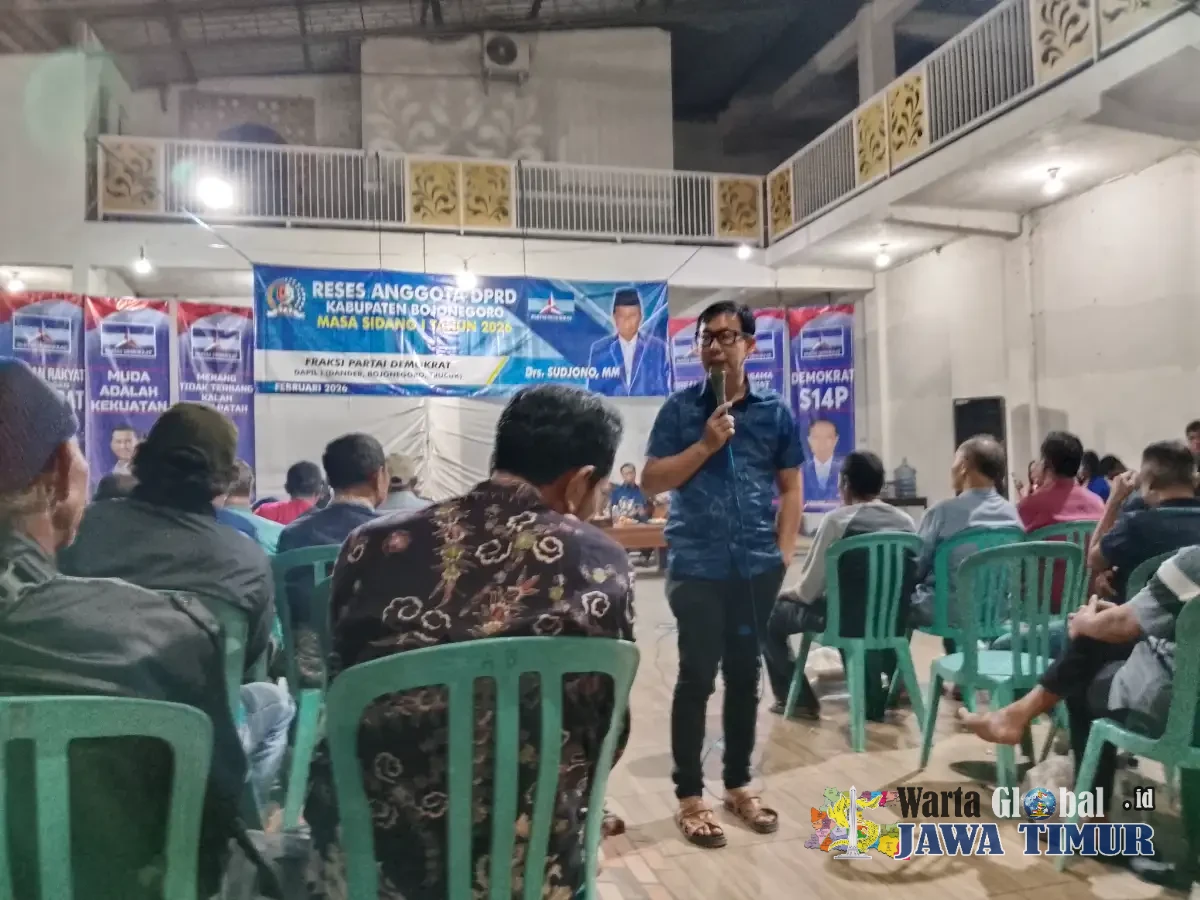 BOJONEGORO –Jatim.Wartaglobal.id - Aspirasi warga kembali mengemuka secara lugas dalam kegiatan reses Anggota DPRD Kabupaten Bojonegoro dari Fraksi Partai Demokrat, Sudjono, yang digelar pada Masa Sidang I Tahun 2026 di Aula RS Auto Car, Jalan Veteran, Kota Bojonegoro, Sabtu (7/2/2026) malam.