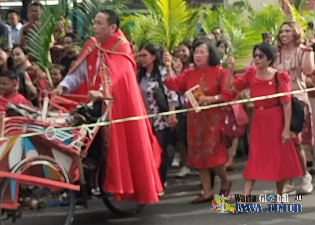 Romo Andre sebagai imam diarak menaiki becak, diiringi seluruh umat yang berjalan bersama sambil melambaikan daun palma dan melantunkan pujian Hosana, Minggu (29/3/26).JEPARA, WARTAGLOBAL.id --