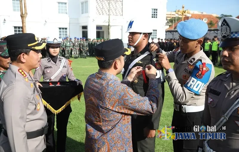 Wali Kota Surakarta, Respati Achmad Ardianto, menyematkan pita kepada personel Polresta Surakarta yang melaksanakan tugas pengamanan Arus Mudik dan Balik Lebaran 2026, Kamis (12/3/26).SURAKARTA, WARTAGLOBAL.id --