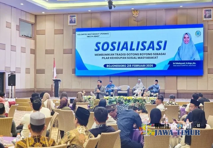 Wakil Ketua IV DPRD Provinsi Jawa Timur, Sri Wahyuni, menggelar sosialisasi bertema “Membumikan Tradisi Gotong Royong sebagai Pilar Kehidupan Sosial Masyarakat” di Dewarna Hotel, Sabtu (28/2/2026).