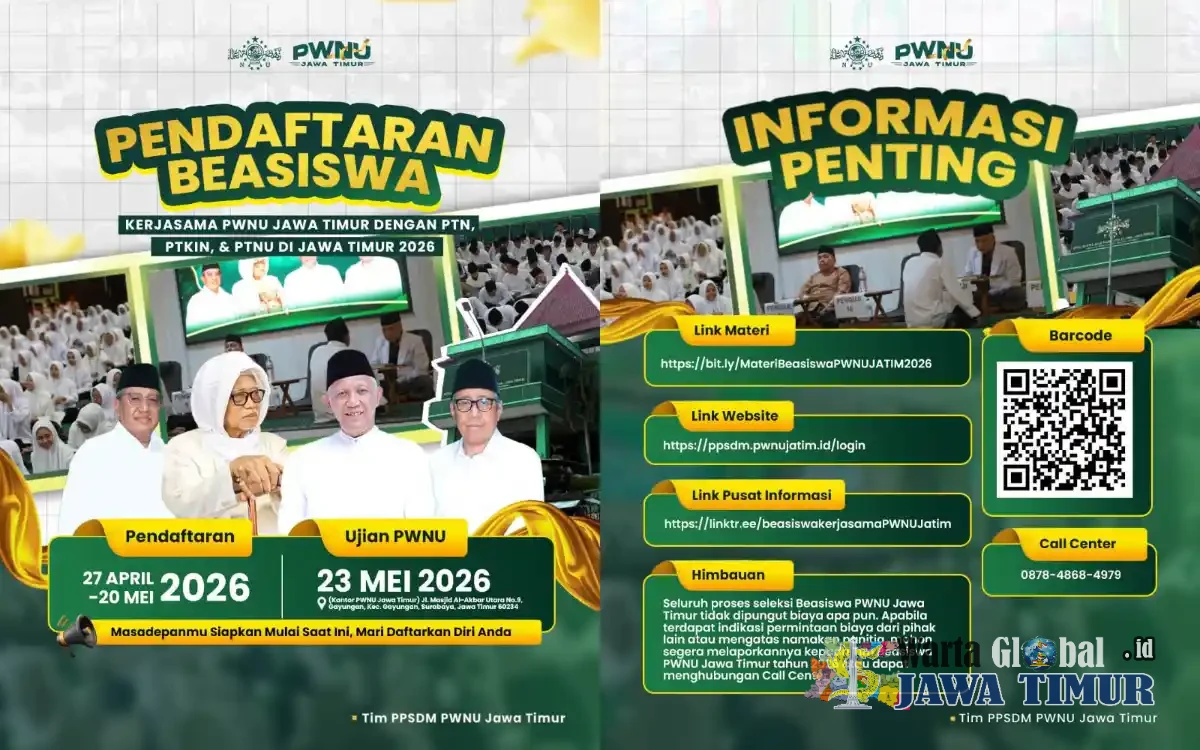 SURABAYA, Warta Global Jatim.id — Kabar menggembirakan bagi para pejuang ilmu, khususnya kalangan santri dan generasi muda Nahdlatul Ulama. PWNU Jawa Timur resmi membuka program Beasiswa PWNU Jawa Timur 2026, sebagai upaya nyata dalam mencetak sumber daya manusia unggul, berdaya saing, dan berakhlakul karimah.