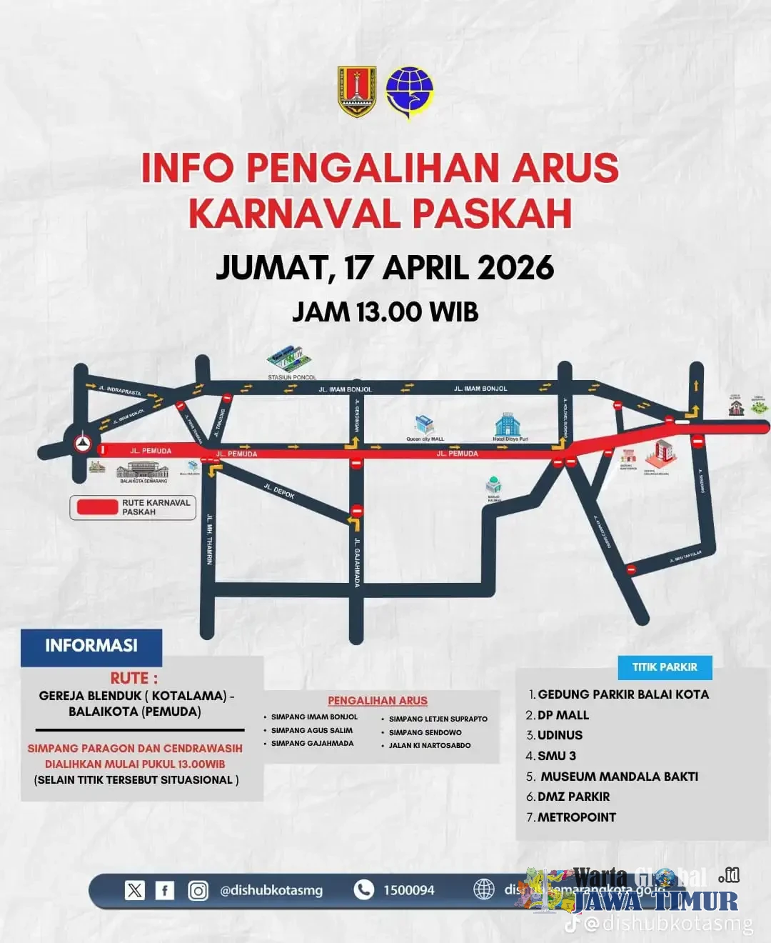 Titik Pengalihan Arus: Pengalihan arus diberlakukan secara bertahap di simpang strategis seperti Jl. Imam Bonjol, Jl. Agus Salim, Jl. Gajahmada, Jl. Letjen Suprapto, Jl. Sendowo, dan Jl. Ki Nartosabdo.
