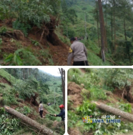 Warga dan Polisi saat membersihkan Longsor dan Pohon Pinus yang tumbang di Petungkriyono, Senin (6/4/26).PEKALONGAN, WARTAGLOBAL.id --
